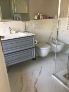 Contestualmente, il cliente ha scelto di procedere con il rifacimento completo di un bagno, intervenendo sia sugli impianti sia sulle finiture, con l’obiettivo di rinnovare l’ambiente e adeguarlo a uno standard contemporaneo, in linea con una residenza di charme in Costa Azzurra.