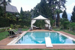 Una piscina moderna che, grazie ai materiali utilizzati e all’accurata progettazione, si integra armoniosamente con la villa storica e il contesto esclusivo del Lago Maggiore.